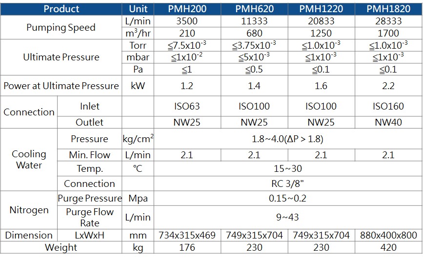 PMH系列乾式多級魯氏真空泵浦技術規格